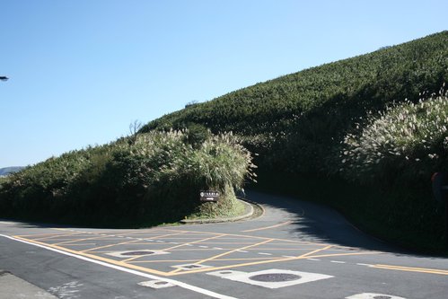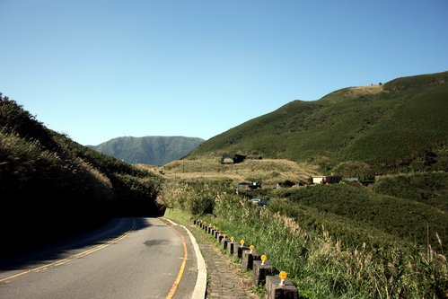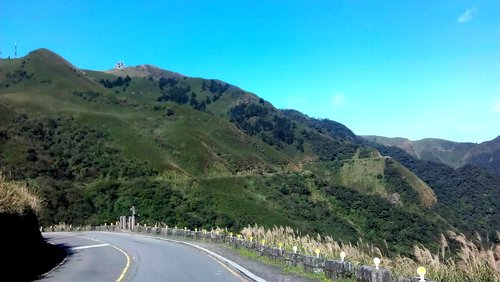 車行至道路的最高點 右上前進小油坑 左下往金山方向而去