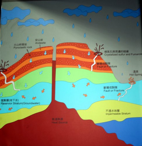 有地熱存在,所以降水時,水由斷層造成的裂縫進入地底受熱變